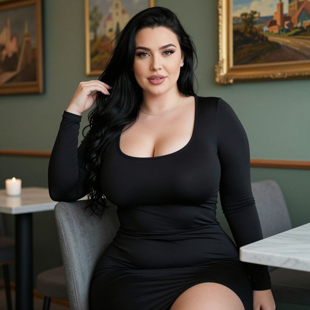 Photograph of a curvy woman with long black hair and fair skin, sitting in a cozy café. She's wearing a tight, black, long-sleeve dress that highlights her large breasts and full hips. Her right hand rests on her hair, and she's looking directly at the camera with a slight, confident smile. The background includes framed paintings, a green wall, and a marble table with a candle.