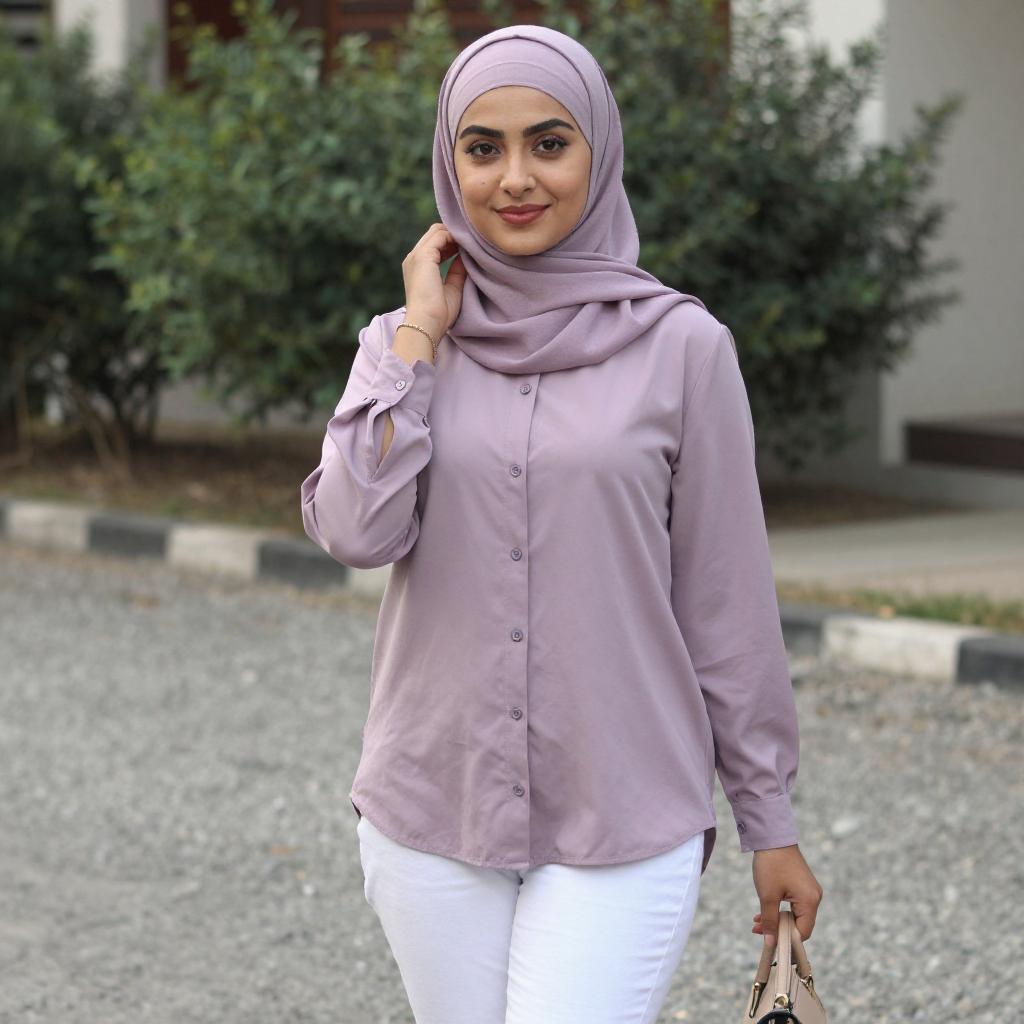 Photograph of a curvy woman with light skin and dark eyes, wearing a pale pink hijab and matching long-sleeve dress. She holds a small white purse with a gold chain strap in her right hand, adjusting her hijab with her left hand. She stands in front of a beige building with rectangular windows, with a grassy and rocky ground in the background.
