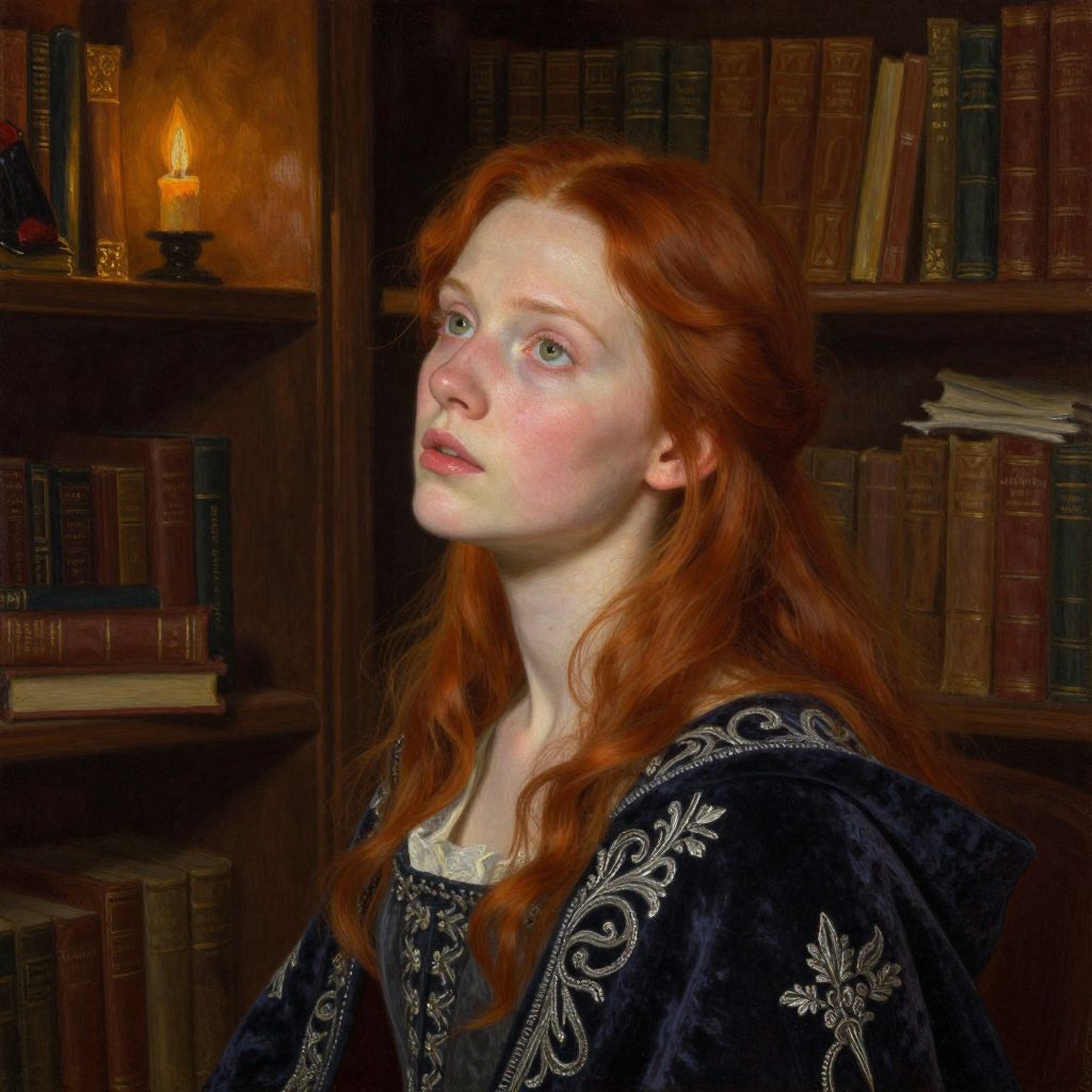A digital painting of a pale, fair-skinned young woman with long, wavy red hair, wearing a dark blue velvet cloak adorned with intricate silver embroidery. She gazes upward with a pensive expression. Behind her, a wooden bookshelf filled with leather-bound books and a lit candle casting a warm glow. The woman's delicate features and ethereal quality contrast with the rich, dark tones of the background, creating a mystical, almost medieval atmosphere.