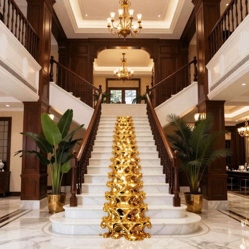 This is a photo of an opulent, two-story foyer. A grand staircase with white marble steps and golden, shimmering liquid running down the center leads up to the second floor. The walls are adorned with dark wood panels and there are elegant chandeliers hanging from the ceiling. Tall green plants are placed on either side of the staircase. The floor is marble with a polished, reflective surface.