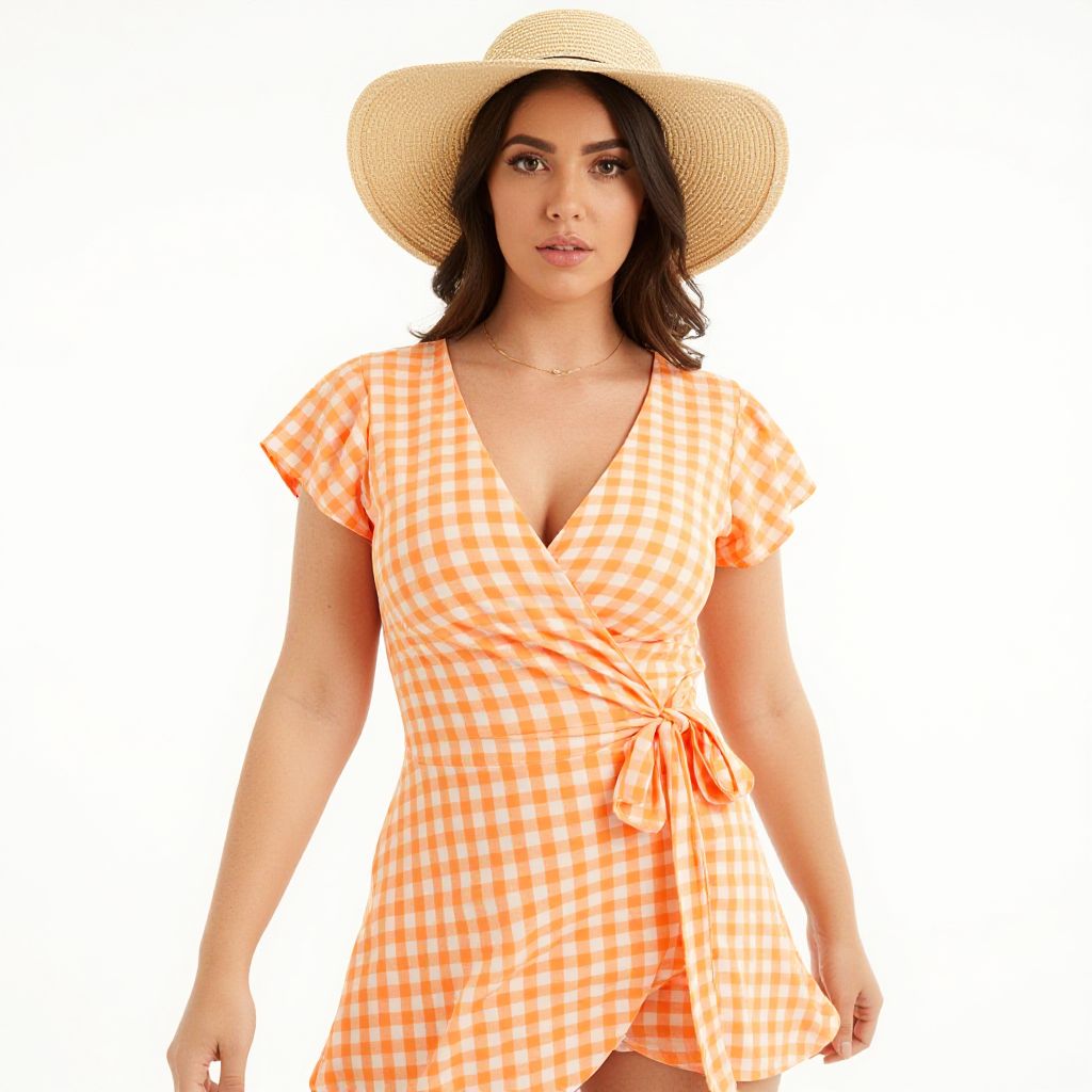 "Woman, casual summery, orange and white gingham print wrap dress, short flutter sleeves, V-neckline, thigh-length hem, tied at the waist, accessorized with a thin gold necklace, straw sun hat with wide brim, white background.. Sexy. Pretty face and beаutiful eyes. Big breasts."