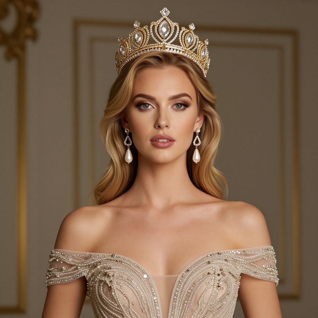 Elegant blonde woman wearing a sparkling gold crown adorned with intricate diamond details, complemented by dangling pearl earrings and a sheer off-the-shoulder gown embellished with delicate beadwork, exuding regal sophistication.