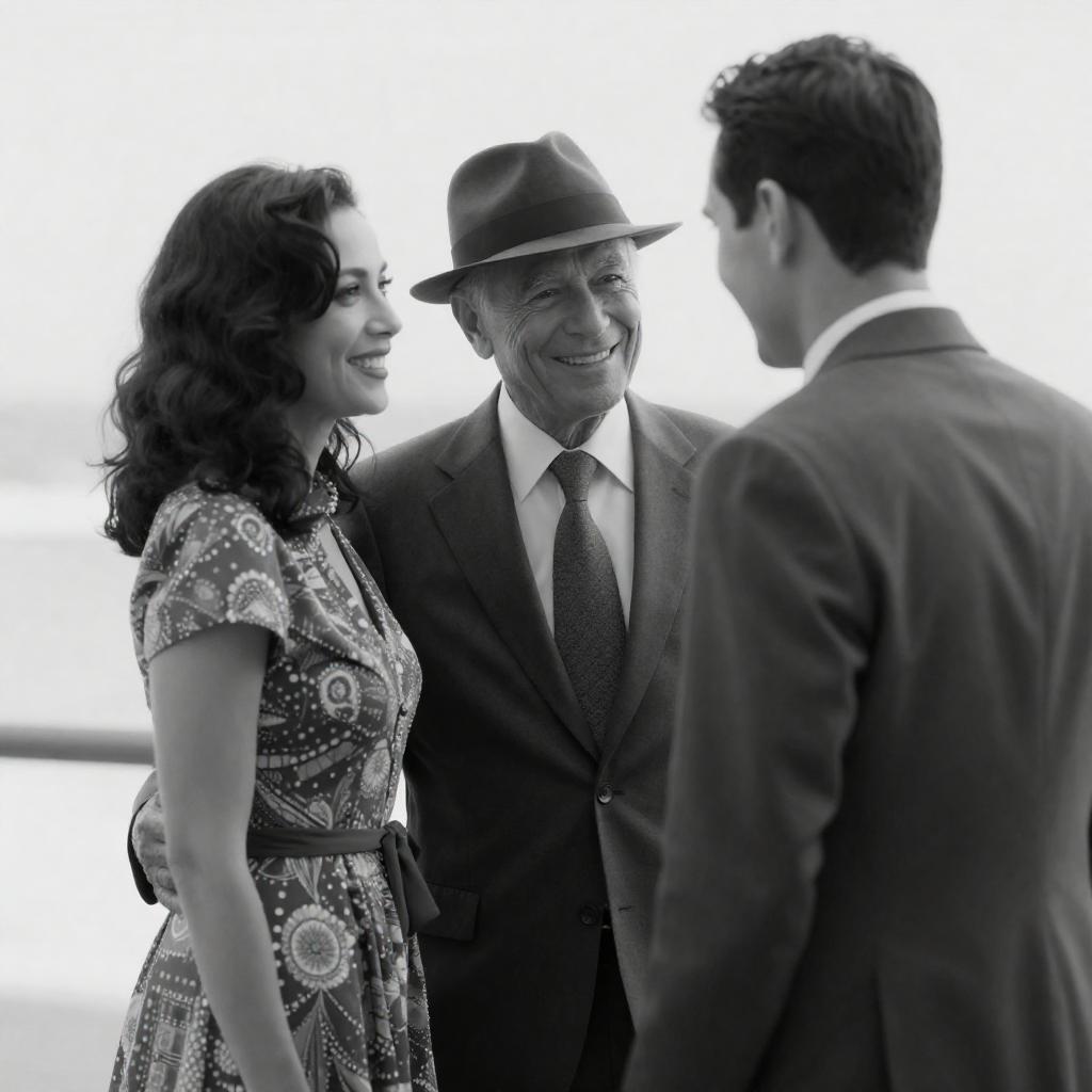 Black-and-white photograph of three smiling people. A woman with wavy dark hair and a patterned dress stands on the left, her arm around an older man in a suit and fedora. A man with short hair, facing away, stands on the right. Bright background.