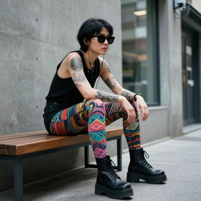 Photograph of a young, white man with black hair and tattoos, sitting on a wooden bench against a gray concrete wall. He wears black, sleeveless tank top, colorful, patterned leggings with geometric designs in red, blue, yellow, and pink, and black, platform combat boots. He has black sunglasses and multiple necklaces. His arms are adorned with detailed tattoos. The background includes a glass door and urban setting. The overall style is edgy and punk-inspired.