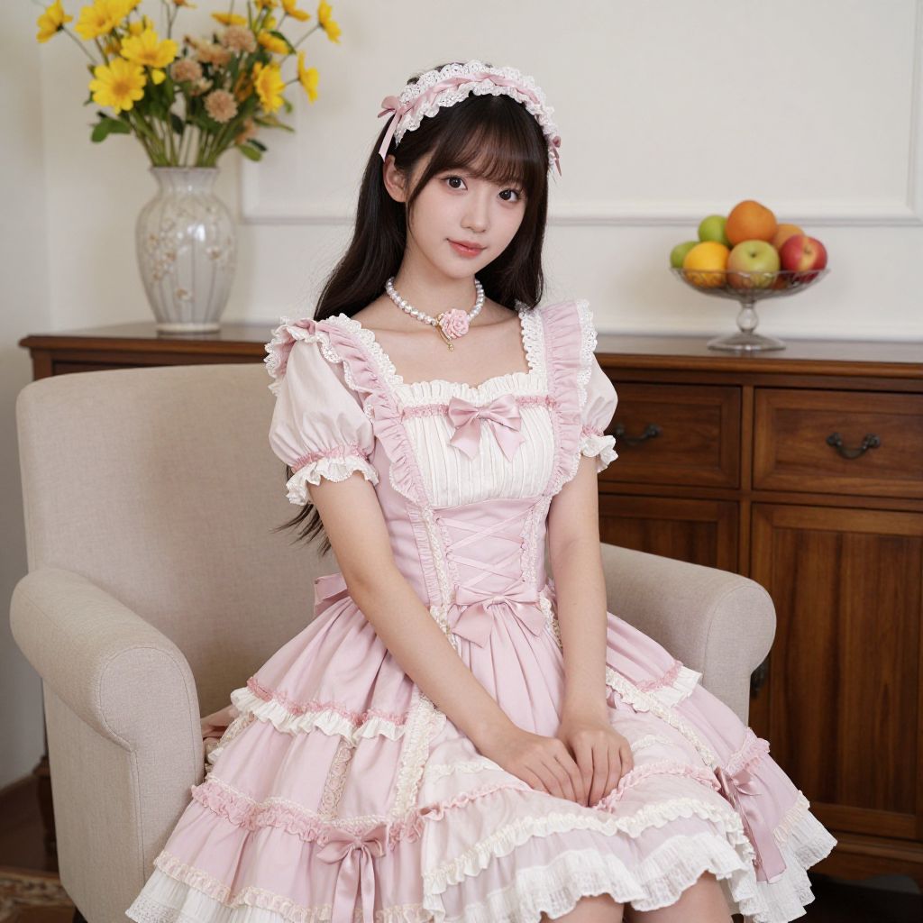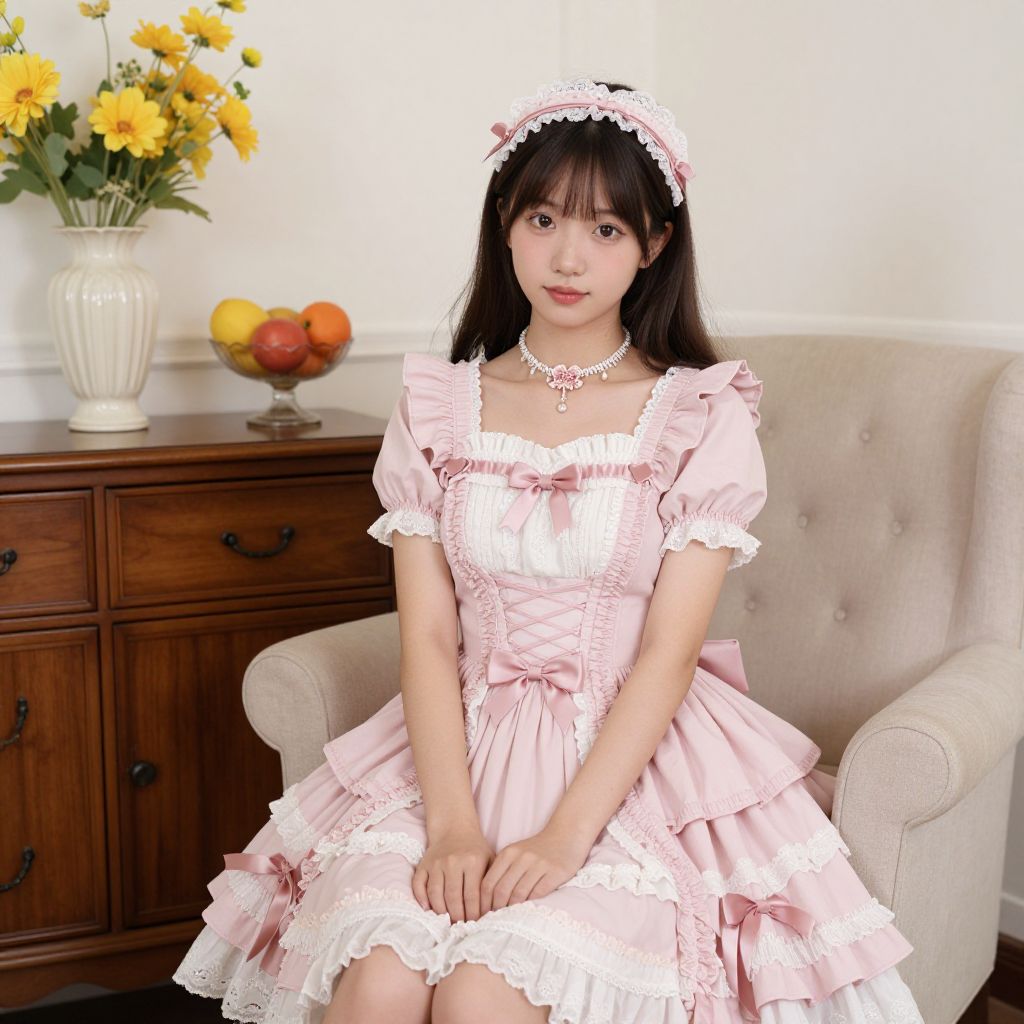 A young woman sits gracefully on a beige armchair, wearing a charming pink Lolita dress with ruffled sleeves and a corset-style bodice, complemented by a matching headband and a delicate floral necklace, while a wooden sideboard adorned with a vase of yellow flowers and a fruit bowl stands elegantly in the background.