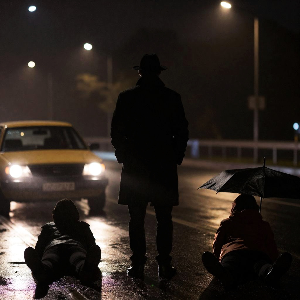Silhouetted man in long coat and hat stands on metal railing, back to viewer, facing second silhouetted figure with cap. White house with horizontal siding, cloudy sky, bushes below, both figures in shadow, intense, quiet, evening light.