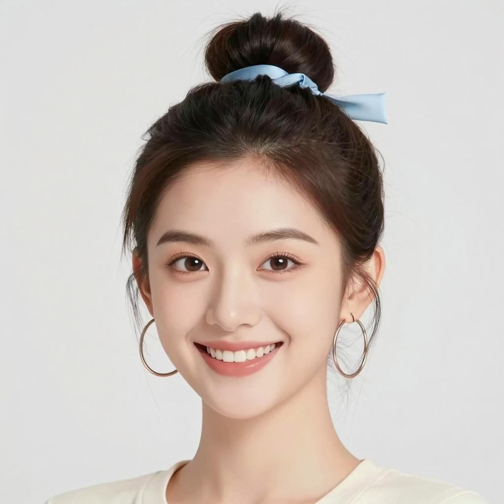 A digitally enhanced close-up portrait of a smiling young Asian woman with a stylish high bun secured by a light blue hairband. She is wearing large gold hoop earrings and a light cream top. The image features a smooth, airbrushed effect and slightly exaggerated facial proportions, creating a hyper-realistic digital illustration style.