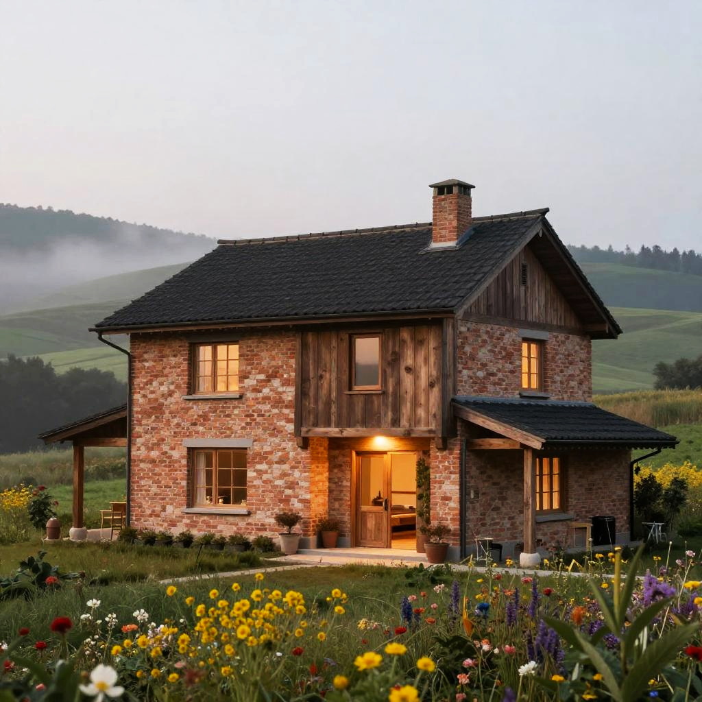 Rustic aesthetic house in a countryside setting, blending traditional materials like exposed brick and timber with modern touches, surrounded by rolling hills and wildflowers, illuminated by soft morning mist and warm ambient lighting.