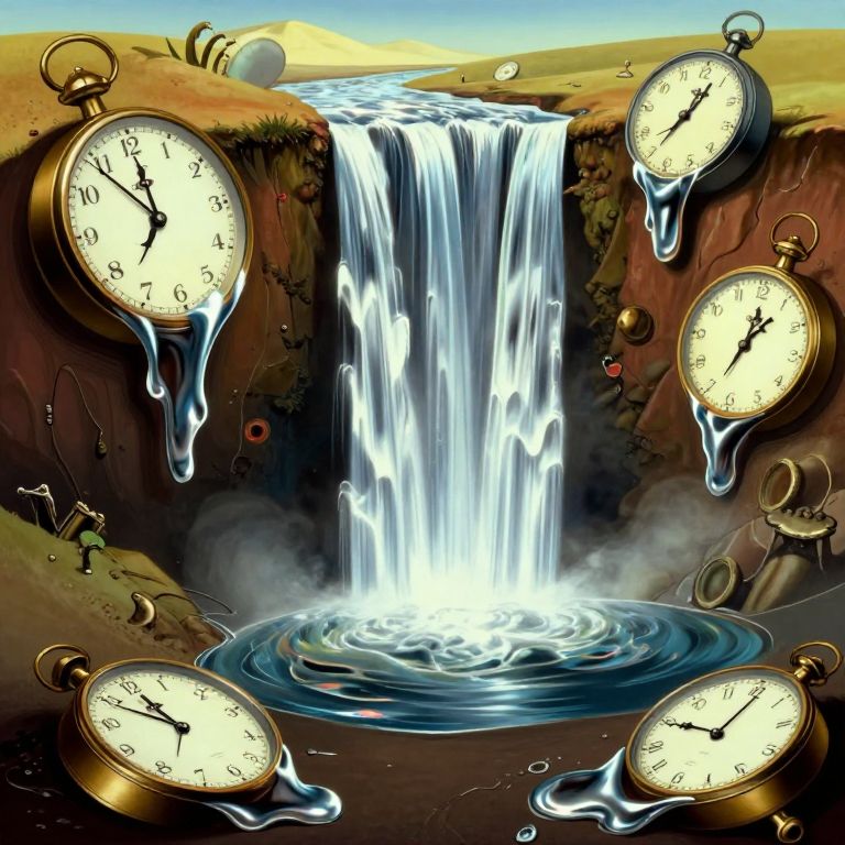 Digital artwork of a waterfall surrounded by dripping, melting pocket watches with white faces and black hands, forming a surreal landscape.