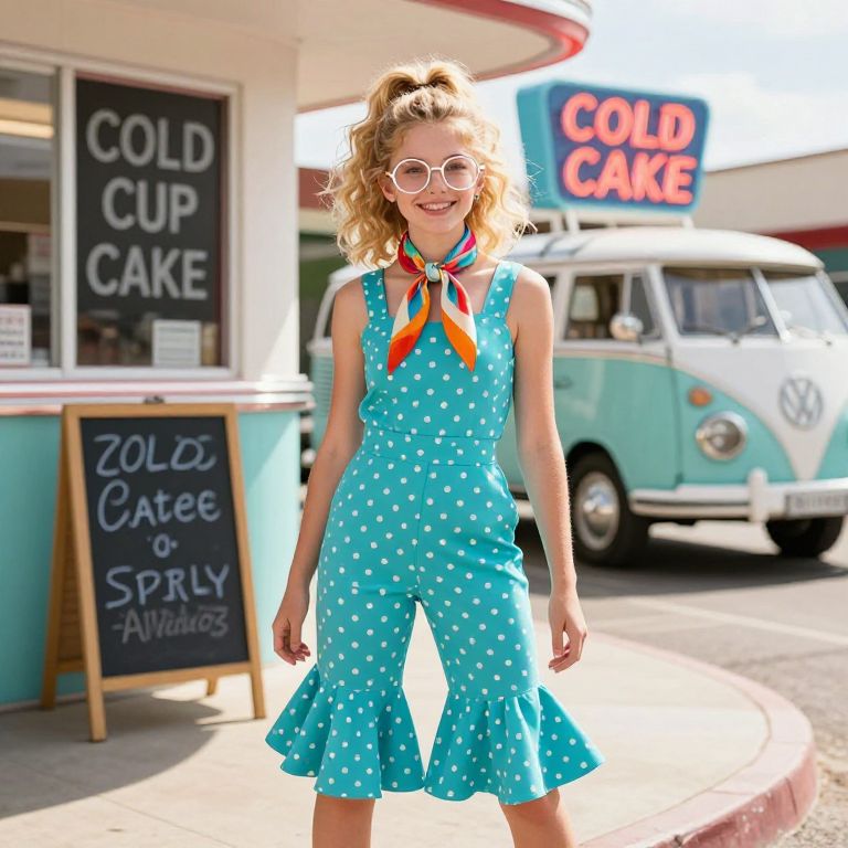 A playful girl in her mid-20s with big round glasses, curly golden hair tied in a messy ponytail, and a retro theme outfit including a turquoise jumpsuit with polka dots, a bell-bottom skirt, and a colorful scarf, standing outside a 1970s-style diner with chalkboard signs, neon signs reading 'COLD CUP CAKE', and a vintage Volkswagen parked in the background, midday sunlight, warm and nostalgic atmosphere, photorealistic image.
