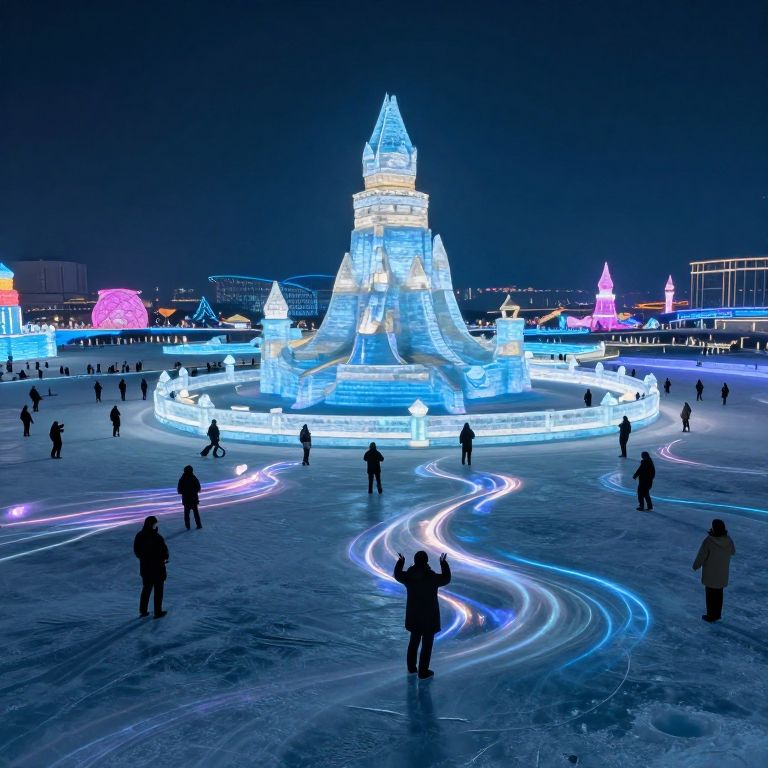 Illuminated ice castle structure at a night-time ice festival with people standing on the frozen surface, colorful light trails creating flowing patterns on the ice. The scene showcases a winter celebration featuring detailed ice sculptures glowing in blue and purple hues.