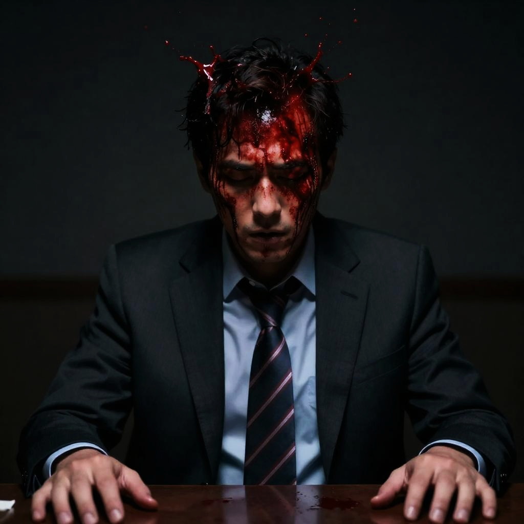 Man in dark suit, light blue shirt, striped tie, with blood exploding from head, covering face. Hands on desk, blood splatters in background. Dark background. Intense facial expression obscured by blood. Film still, dark, violent scene.