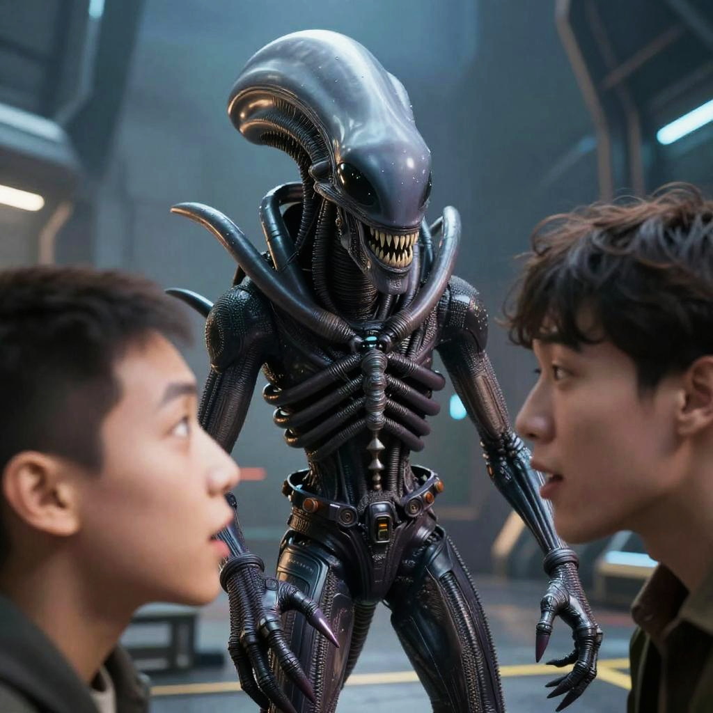 Xenomorph memes portrayed as comic characters interacting with humans in funny, exaggerated facial expressions, sharp sci-fi backgrounds, digital art style