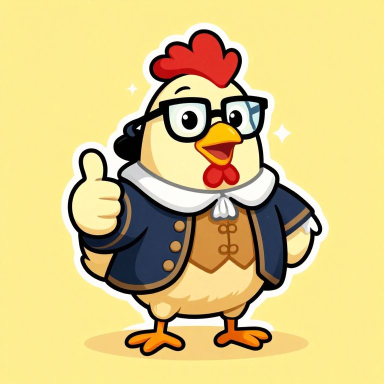 Spontaneous happy cartoon chicken logo doing thumbs, wearing glasses and Shakespeare’s dress in a yellow background,