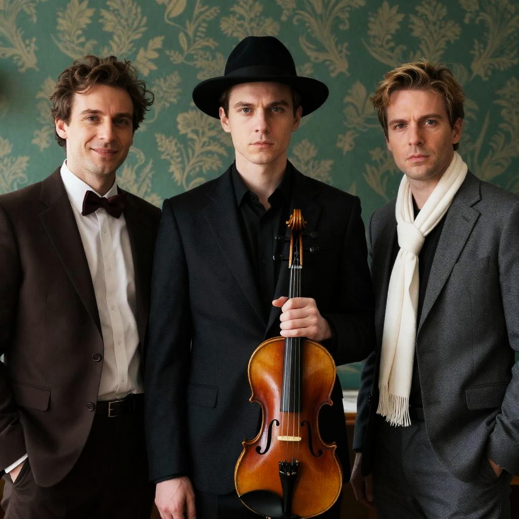Photograph of six men in 1930s-style suits, standing in a dimly lit room. Five men hold string instruments: violin, viola, and double bass. One man wears a bowler hat. Smiling man with receding hair on the left. Background includes green walls and a framed picture. Men have serious or neutral expressions.