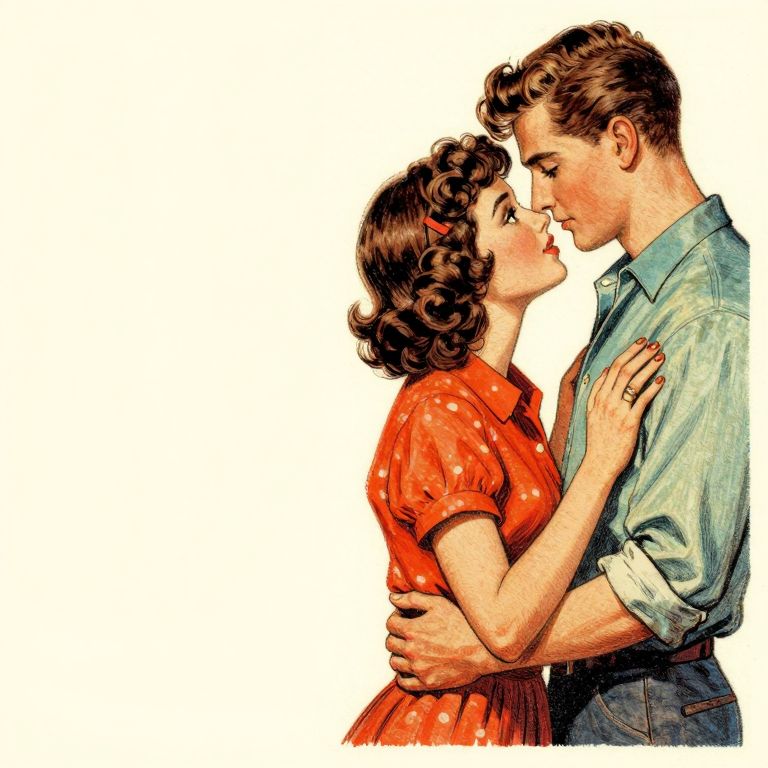Retro Nostalgic Items retro midcentury drawn advertisement, with a couple in love, close up, blank background, 5,