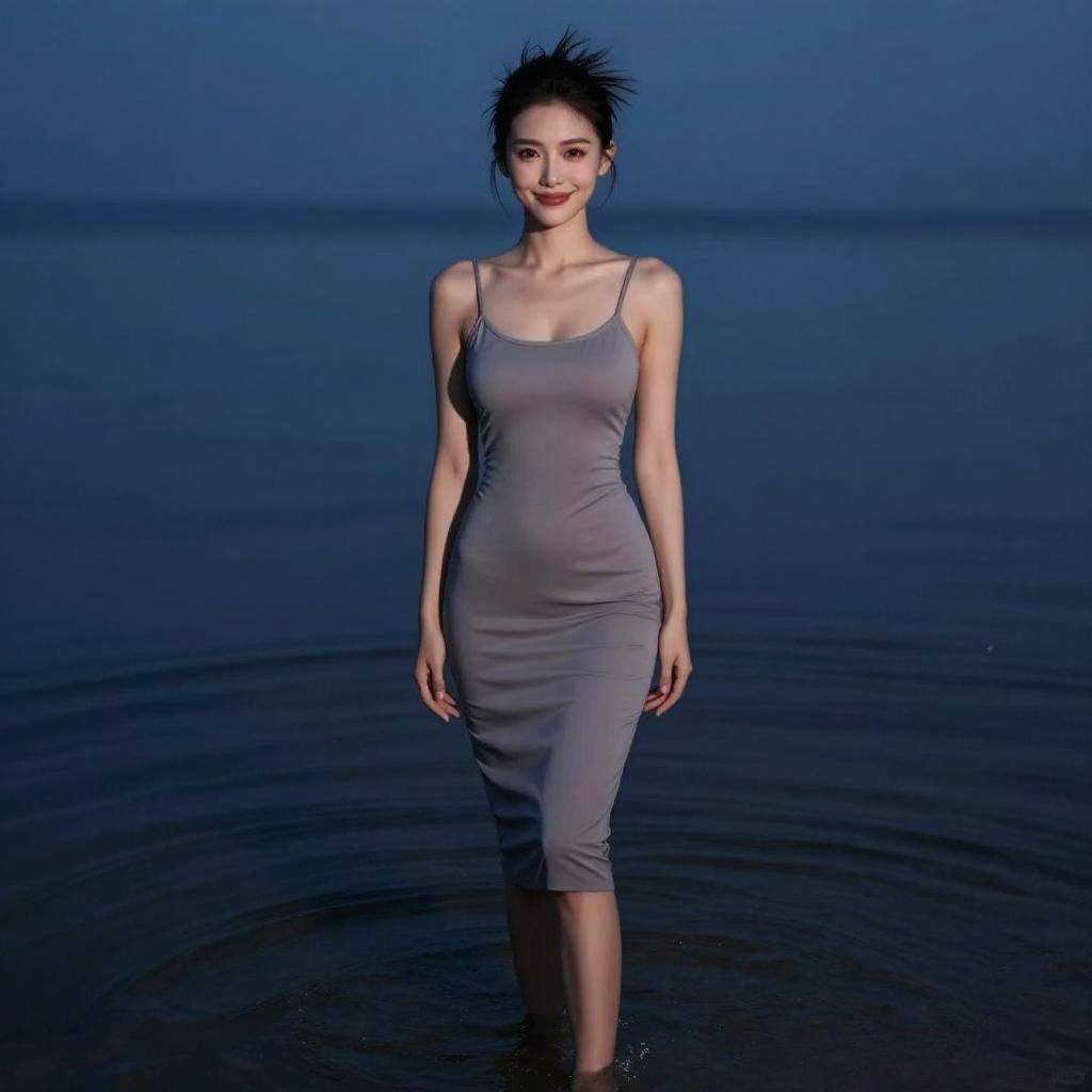 Masterpiece, best quality, (photorealistic:1.4), full body, ocean bottom, a photo of a beautiful woman, evening, skinny, brunette hair, spiky hair hairstyle, detailed face, medium breasts, smiling, hourglass body shape, wearing dress