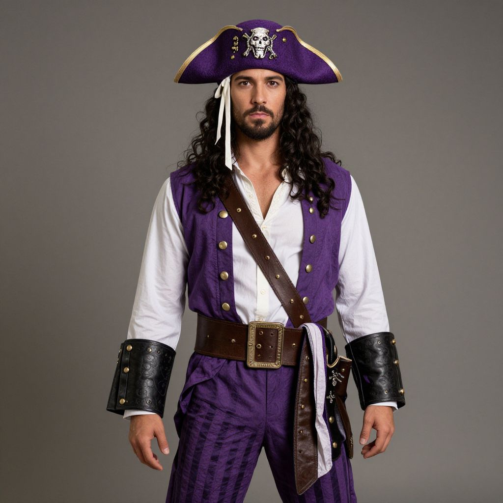 Photograph of a man with long, wavy black hair and a beard, dressed as a pirate. He wears a large, purple tricorn hat with a white skull and crossbones emblem, a white shirt, and a purple vest over it. His outfit includes purple pants with a white stripe, brown leather cuffs on his sleeves, and a brown belt with a large, rectangular buckle. He stands against a plain gray background, looking directly at the camera with a serious expression. The texture of his clothing is slightly wrinkled, adding to the pirate aesthetic.