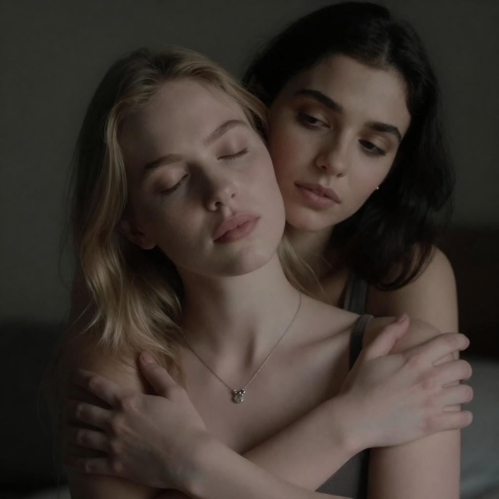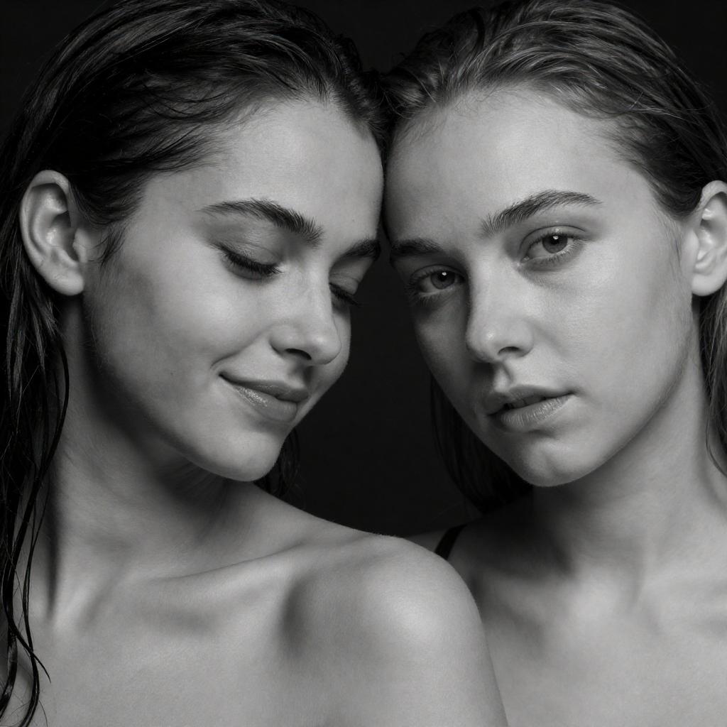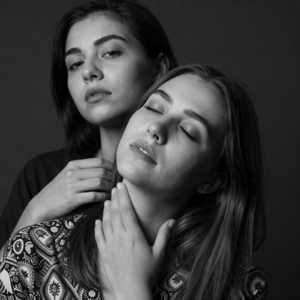 Black-and-white photograph of two women. Woman in foreground with long hair, eyes closed, relaxed expression, hand on neck. Woman in background, short hair, focused, hand on foreground woman's neck. Patterned fabric, dark background. Intense lighting highlights faces.
