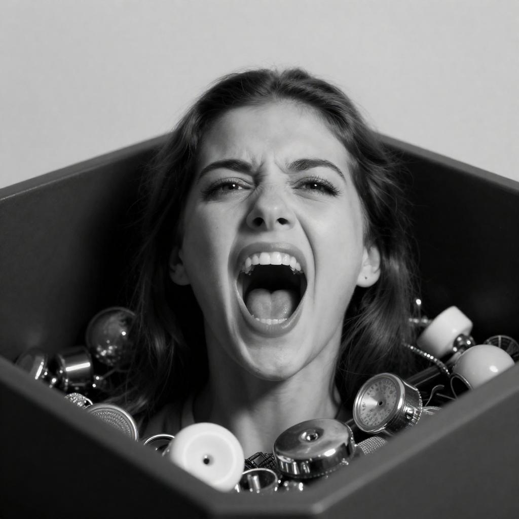 Black-and-white photograph of a woman with her mouth open in a scream, head tilted back, eyes wide, inside a dark, angular container filled with shiny objects. High contrast, intense expression. One person.