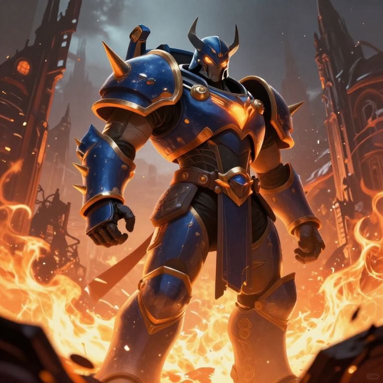 A digital illustration of a massive, imposing armored warrior standing in a fiery, apocalyptic landscape. The warrior's armor is dark blue with glowing orange accents, and it's heavily spiked and detailed. The background features tall, gothic-style buildings in shadow, with bright white and orange flames illuminating the scene. The warrior's helmet has a menacing, glowing eye, and the overall style is highly stylized and dynamic.