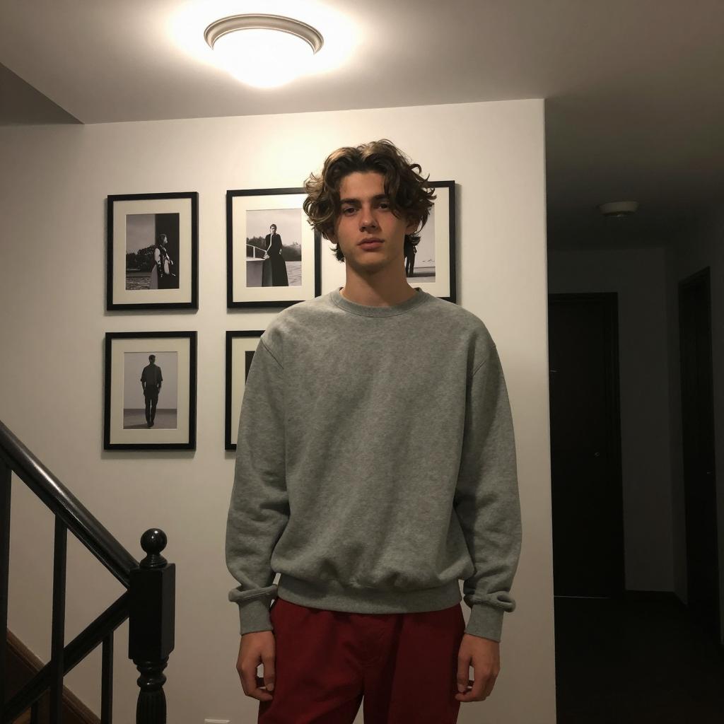 Young man with wavy brown hair, wearing a gray sweatshirt and red pants, standing in a dimly lit hallway. Light from ceiling fixture above. Black-framed pictures on white wall behind. Stair railing on left. Dark shadows on right.