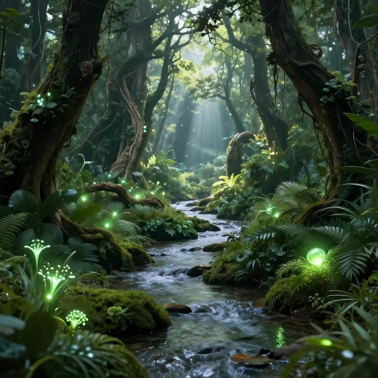 Digital artwork of a mystical forest with glowing green fireflies, lush ferns, and a flowing stream under sunlight filtering through trees.