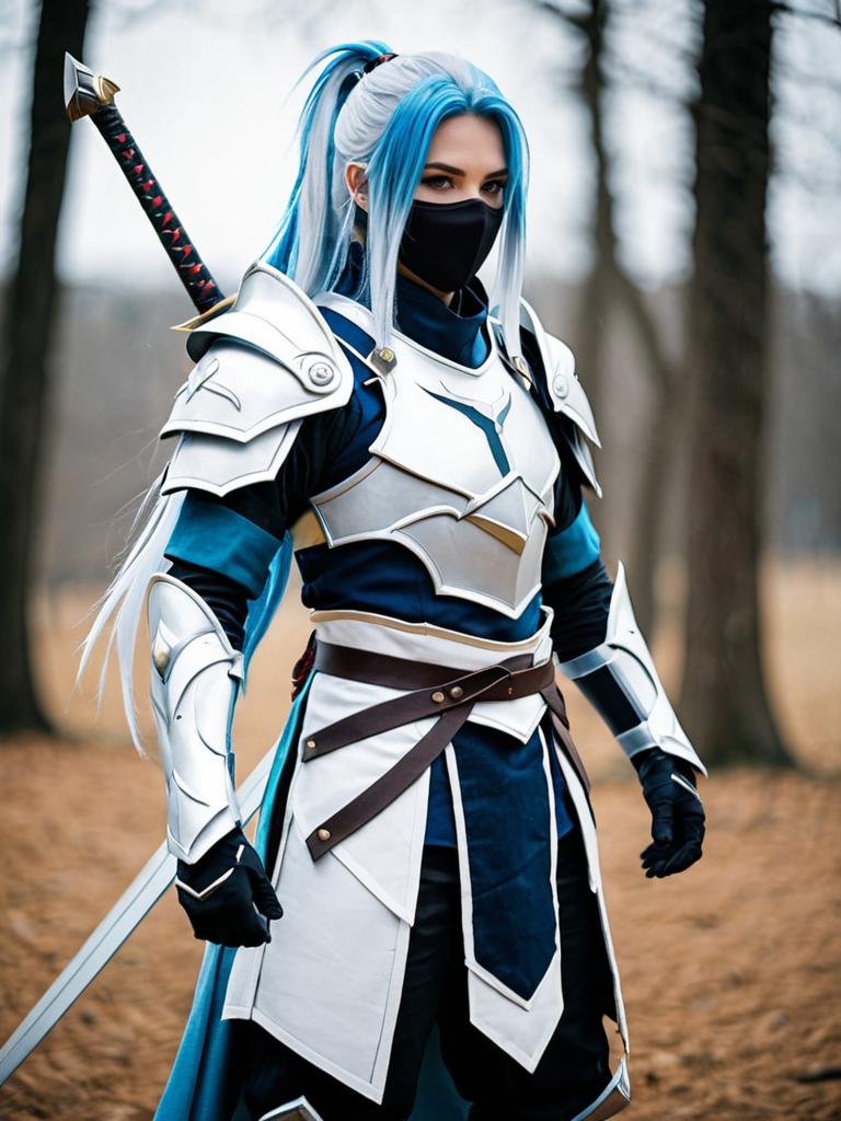 Photo-realistic cosplay photo of person standing in hakumen costume. 1boy, long hair, very long hair, blue hair, white hair, ponytail, armor, armor, mask, swordfull body shot. lifestyle stock photo, shallow depth of field, lifestyle stock photography, shallow depth of field, natural lighting, warm tones, soft background blur, vibrant colors, realistic textures