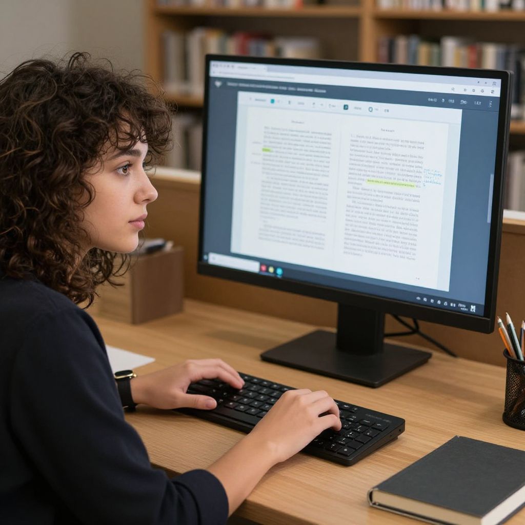 A quiet library study nook with a well-lit wooden table, featuring a high-resolution interface monitor displaying a book's digital version with annotated margins and voice-activated search tools; a young woman in her early 20s with warm brown eyes and messy dark curls reads from a screen with her fingers lightly gliding over the interface.
