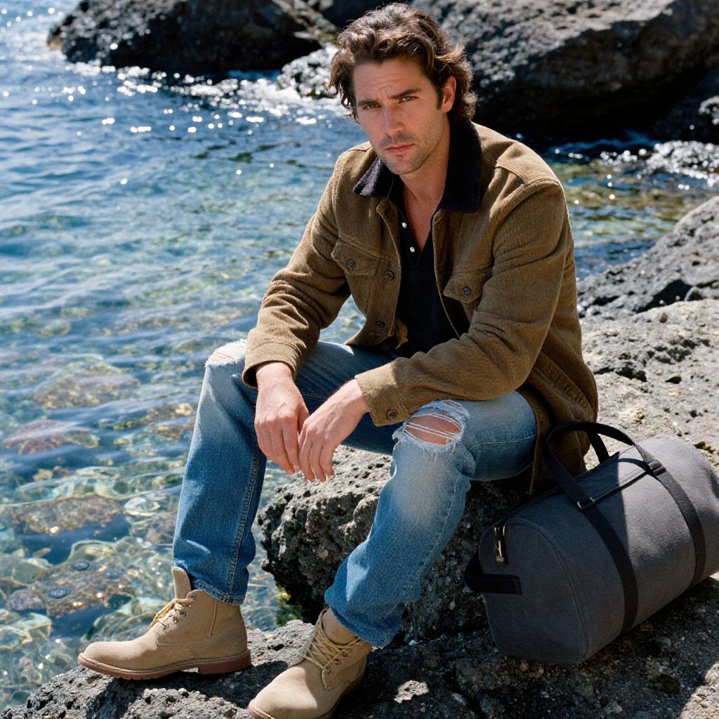 Photograph of a handsome, dark-haired man with rugged features, wearing a brown jacket, ripped jeans, and tan boots, sitting on rocky shore by