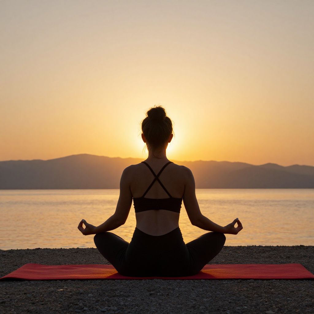 Silhouetted against the golden sunset, a woman meditates in a tranquil lotus pose on a vibrant red yoga mat, her hands forming mudras as she faces the shimmering horizon where the sun descends over distant mountains and calm waters.