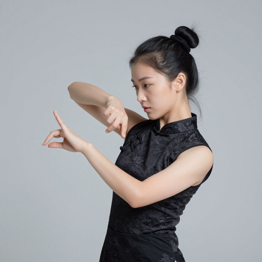 "modern contemporary dance, 1girl, chinese clothes, parody, black hair, realistic, hair bun Realistic photo of casual sexy person with pretty face"