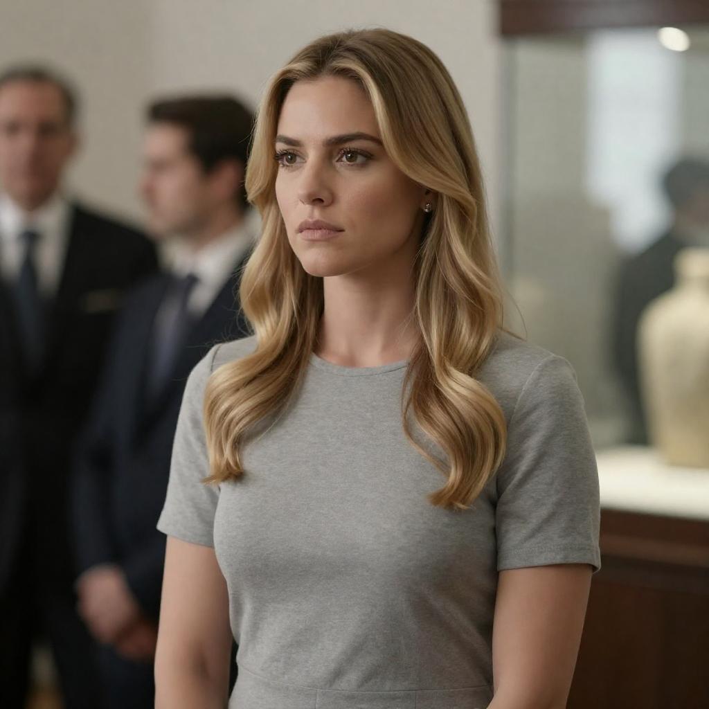 Blonde woman in beige suit, white dress, holding yellow envelope, brown handbag, standing in dimly lit hallway, curved staircase behind, shadow patterns on wall, serious expression, indoor setting.