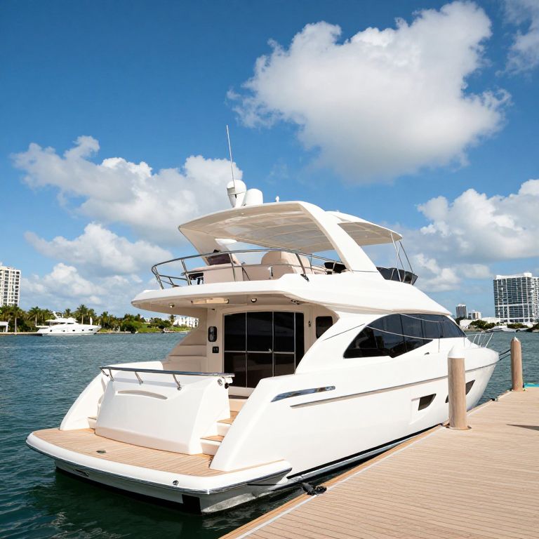 Luxurious Sea Force IX Enclosed Flybridge (2005) docked in Fort Lauderdale, Florida, showcasing its sleek white exterior, prominent flybridge structure, and expansive deck under a vibrant blue sky dotted with fluffy clouds.