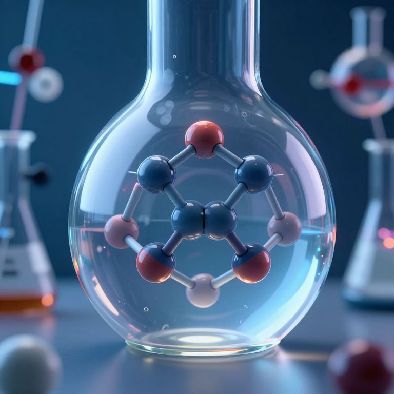 Benzene molecule visualized inside a crystal-clear glass flask, surrounded by laboratory equipment and softly glowing chemical reactions, high-detail photorealistic style emphasizing the symmetry of the hexagonal carbon ring