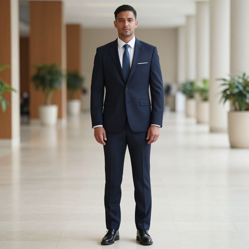 Flattering Work Costume, image of a man in a suit standing in a hall