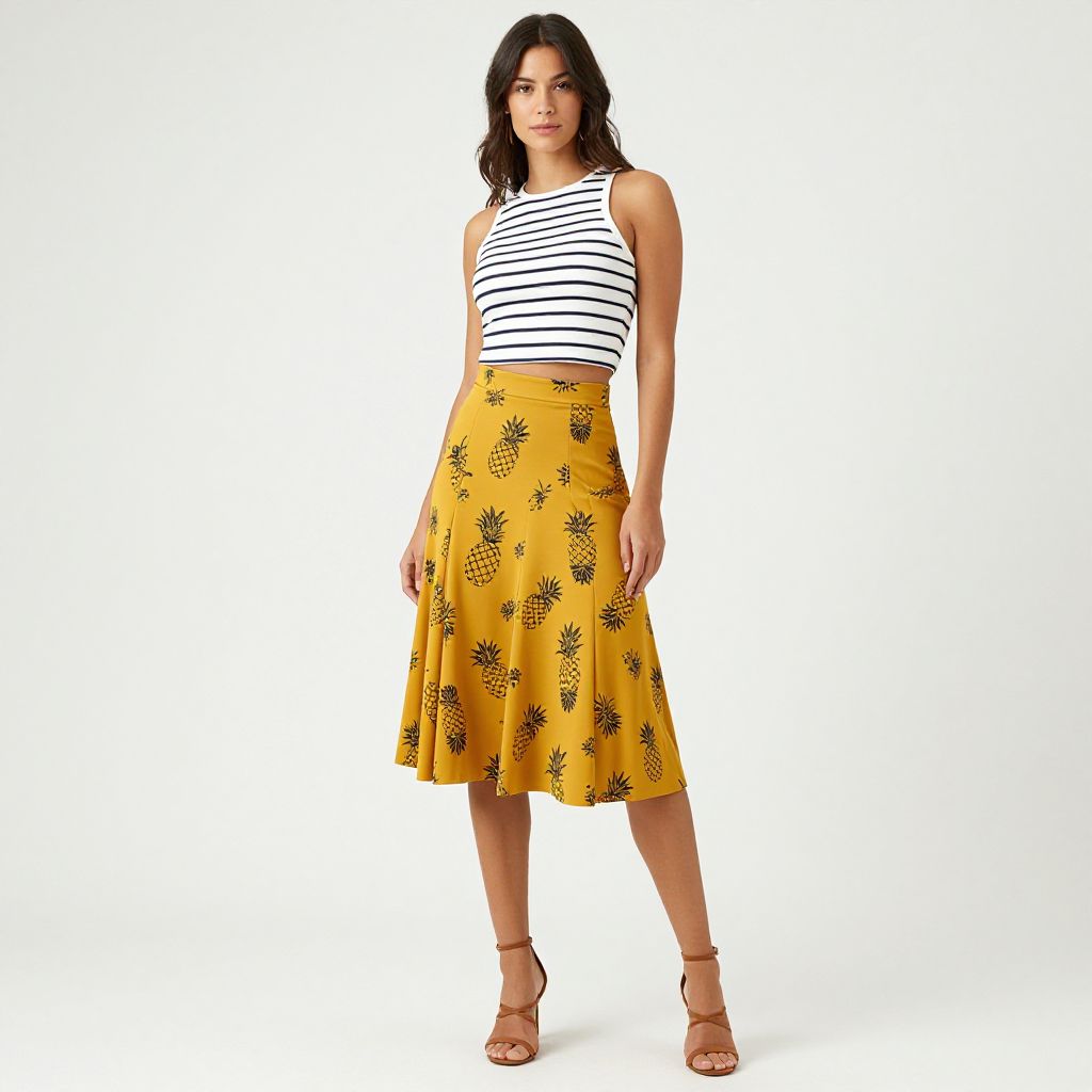 "Woman, nautical-inspired, sleeveless crop top in white with horizontal navy stripes, high round neckline, flared high-waisted midi skirt in mustard yellow with pineapple print, side pockets, strappy high heel sandals in brown, clean and minimal styling, plain white studio background. Sexy. Pretty face and beаutiful eyes. Big breasts."