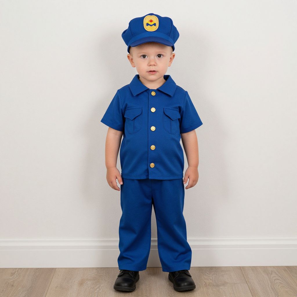 Toddler postman costume, 1boy, male focus, solo, hat, full body, standing, realistic, looking at viewer