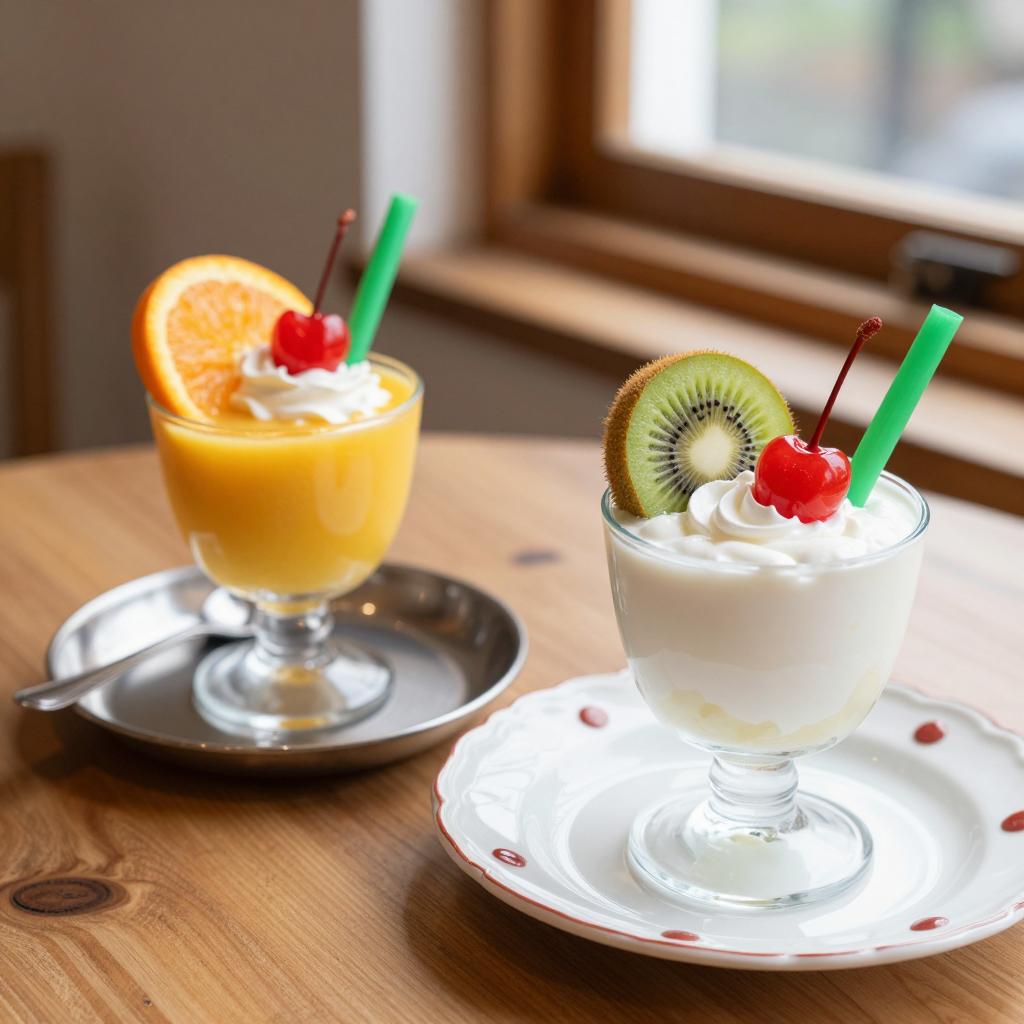 Two colorful desserts on wooden table. Left: yellow parfait with orange slice, cherry, green straw, on silver saucer. Right: white parfait with kiwi slice, cherry, green straw, on white plate with red dots. Sunlight filters through window.