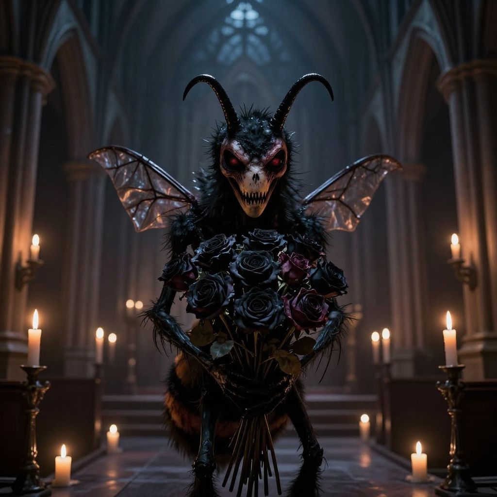 Hyperrealistic art Horror-themed, evil Hornet monster holding a bouquet of decaying black roses, gothic horror, inside a church, gothic style, candle lit, dark scene, atmospheric, night time