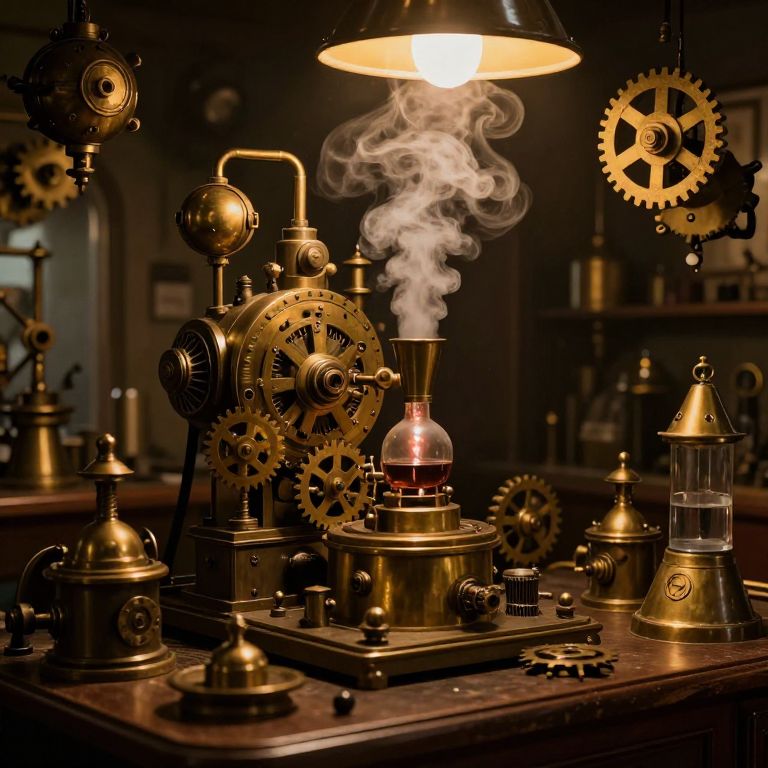 Resory steampunk laboratory filled with brass gadgets and gears, intricate machinery emitting soft steam, warm amber lighting, vintage Victorian aesthetic with detailed props and textures, imaginative and mysterious atmosphere