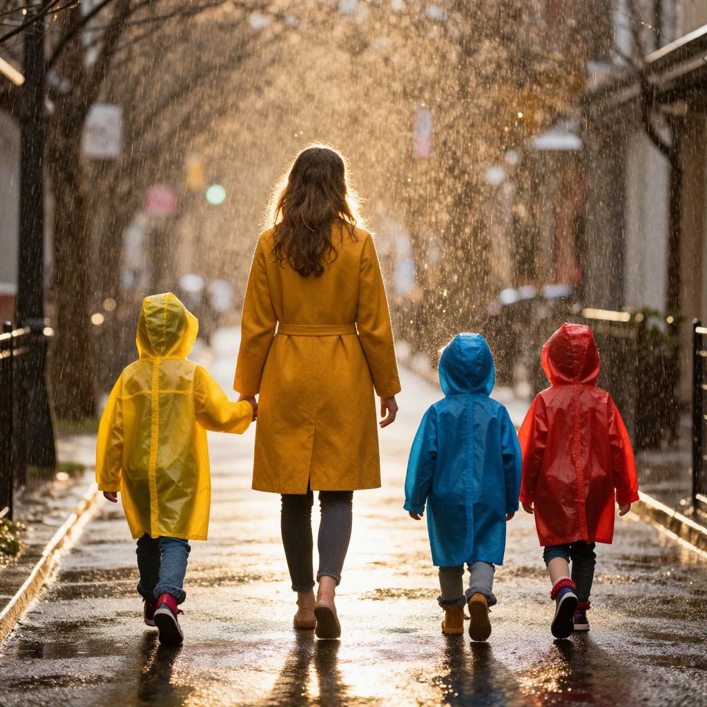 Photograph of a woman with long brown hair wearing a yellow raincoat walking down a wet, rain-soaked street with three children in colorful raincoats (yellow, blue, and red) holding her hands. The street is illuminated by streetlights and the sun, with water droplets visible in the air. The background shows blurred urban buildings and street signs. The scene exudes a warm, nostalgic atmosphere, with the children's raincoats and the woman's yellow coat creating vibrant contrasts against the gray street.