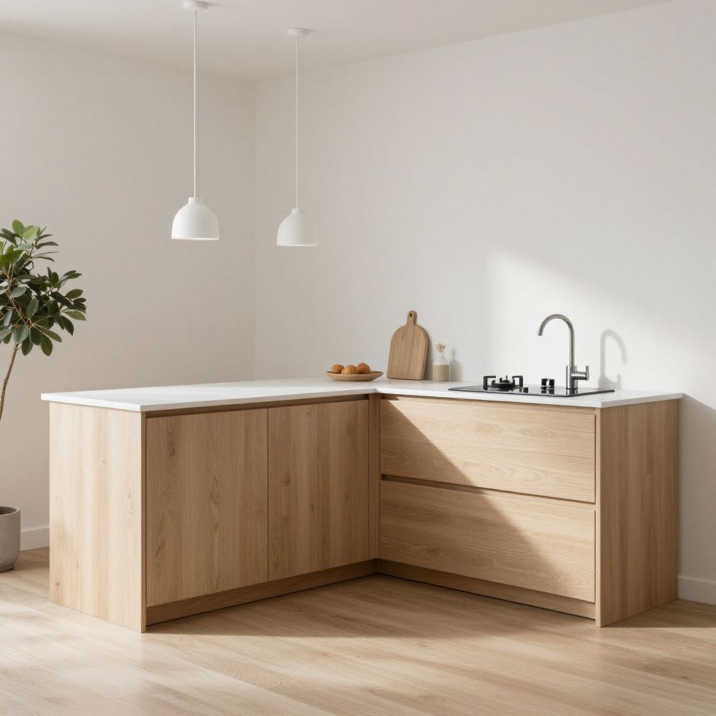 Minimalist L shape counter in a Scandinavian style kitchen, light oak wood texture, clean white countertops, elegant pendant lights hanging above, soft natural daylight, neutral color palette with pops of greenery, cozy and functional design, photorealistic image