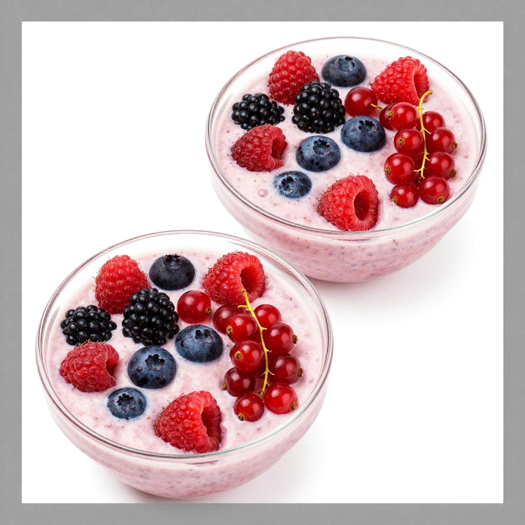 Photograph of two clear glass bowls filled with white yogurt, each topped with a colorful mix of fresh berries and currants. The bowls are positioned close to each other on a white background, with a grey border around the image. The yogurt is dotted with bright red raspberries, dark purple blueberries, blackberries, and red and black currants. The berries are fresh and vibrant, adding a juicy texture contrast to the smooth yogurt. The composition is clean and bright, highlighting the fresh and healthy appearance of the fruit and yogurt.