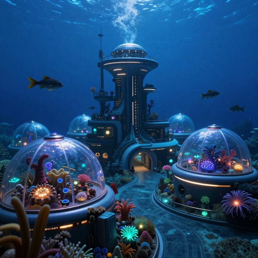Qbam underwater city illuminated by bioluminescent flora and fauna, transparent domes protecting advanced human settlements, deep blue ocean depth with diverse sea creatures swimming, futuristic architecture merging with natural ocean elements, serene and mysterious vibe.