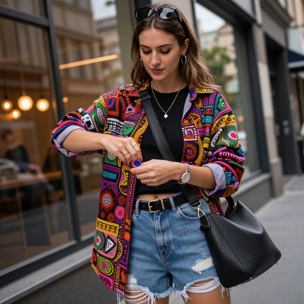 Streetwear influenced accessories, european woman, a european woman accessorizing with streetwear influenced items, urban street style, realistic photography, colorful patterns, city lights reflection, professional fashion photography, dynamic angles