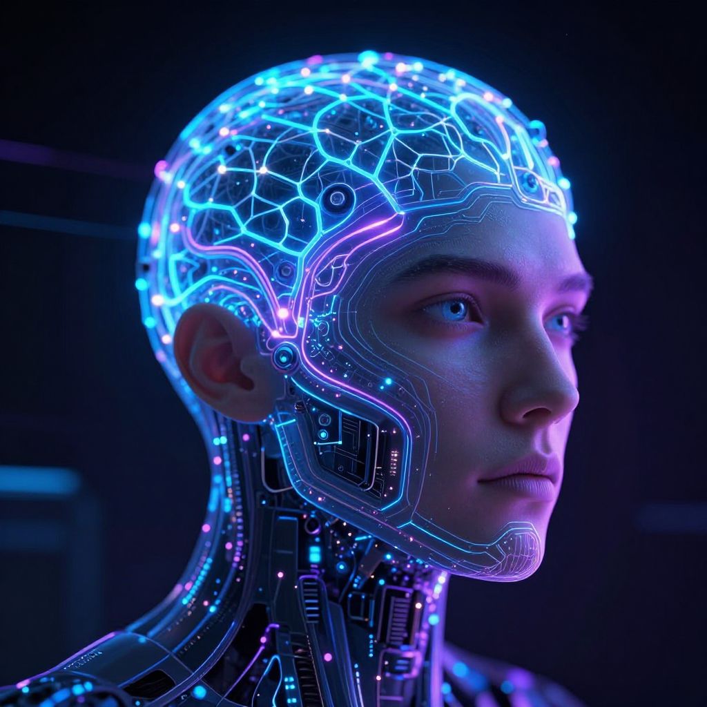 Photorealistic CGI of a glowing, neon-lit cybernetic human head with intricate blue and purple circuitry patterns against a dark background.
