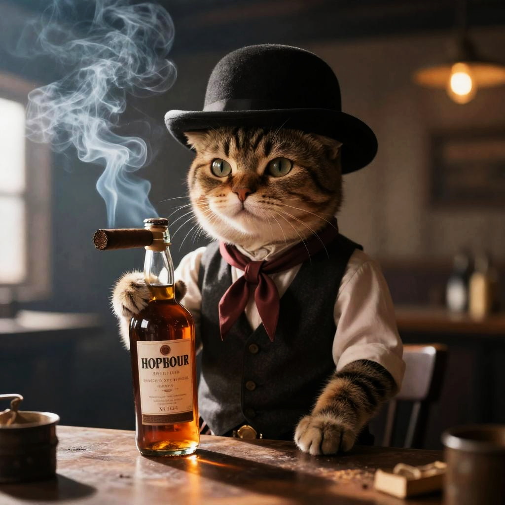 A charming photo of a small (anthropomorphic cat:1.3) wearing a bowler hat and holding a whiskey bottle in an old west saloon. The air is thick and hazy with cigar smoke. Light rays pierce the atmosphere. He is wearing a vest and a scarf.masterpiece, ultra-quality, hyperrealistic, RAW photo, highly detailed, 4k, medium shot, cinematic photography, natural texture, action shot, XF IQ4, 150MP, 50mm, ISO 1000, 1/250s, natural light