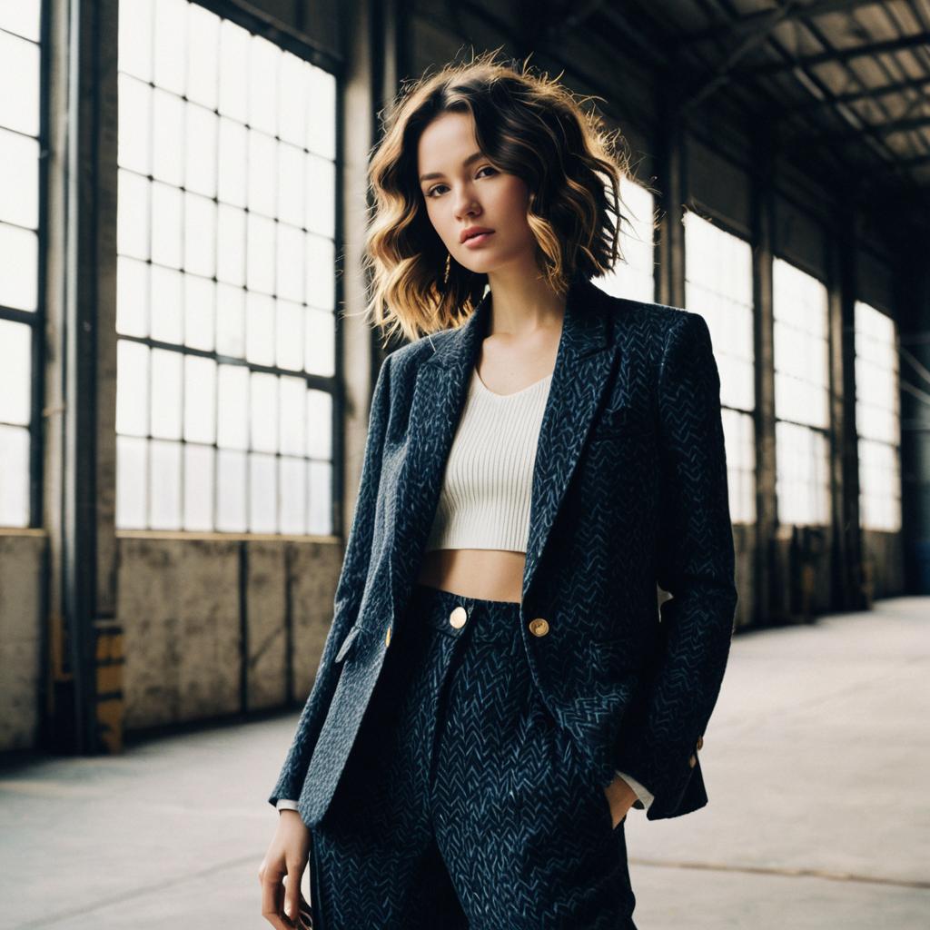 Sleek and Smooth hairstyle on fashion model, wearing tailored blazer and pantsuit, in industrial loft, captured in fashion editorial style with soft diffused glow.