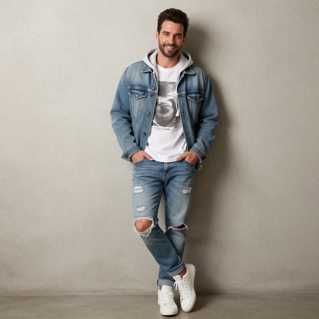 Photograph of a bearded man with short, dark hair, standing against a plain, light gray wall. He wears a light blue, slightly faded denim jacket over a white hoodie with a graphic design, and distressed blue jeans with large, intentional rips on the knees and thighs. His hands are casually in his jeans' pockets, and he wears white, lace-up sneakers. He has a relaxed, confident expression and stands with his weight slightly shifted to one leg. The image has a clean, modern style with a focus on casual, contemporary fashion.